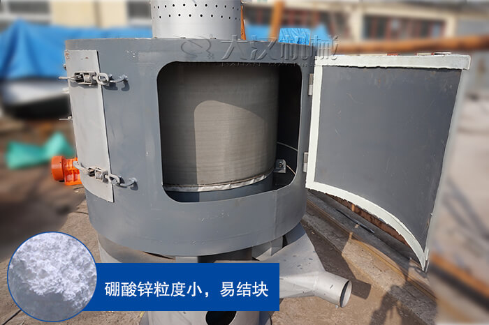 由于硼酸鋅密度般比較小,所以在篩分過程中容易粘在篩網(wǎng)上或造成結(jié)塊,嚴(yán)重影響篩分效率和精度,氣流篩風(fēng)輪葉片的高速旋轉(zhuǎn)可以使結(jié)塊物料被打碎,相當(dāng)于臺(tái)破碎機(jī)和臺(tái)篩分機(jī)的組合,提高了篩分效率。